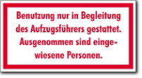 Hinweis für Aufzugsanlagen, weiß-rot, Benutzung nur in Begleitung des Aufzugsführers gestattet. Ausgenommen sind eingewiesene Personen.
