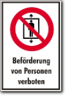 Hinweis für Aufzugsanlagen, Kombischild, Beförderung von Personen verboten