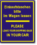blau-gelb, einseitig Folienbeschriftung, Einkaufstaschen bitte im Wagen lassen Please leave your shopping bags in your car