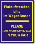 blau-gelb, einseitig Folienbeschriftung, Einkaufstaschen bitte im Wagen lassen Please leave your shopping bags in your car