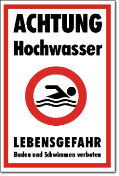 Kunststoff, weiß-schwarz-rot-gelb, ACHTUNG Baden ist lebensgefährlich Schwimmen Sie nicht in diesem Gewässer, auch wenn es noch so verlockend ist. Achten Sie auf Ihre Kinder Gefahr durch Ertrinken, Sog, Wellenschlag und Strömung, Symbol: Warnschild "Wellenschlag" / Verbot: Schwimmen