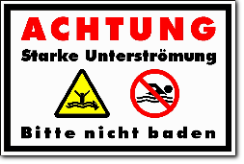 weiß-schwarz-rot-gelb, WARN'UNG starke Strömung Baden auf eigene Gefahr, Symbol: Warnschild "Strömung"
