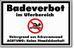 weiß-schwarz-rot, Badeverbot im Uferbereich Untergrund aus Schwemmsand ACHTUNG: Keine Standsicherheit, Symbol: Verbot schwimmen