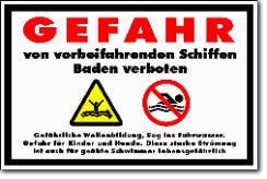 Kunststoff, weiß-schwarz-rot-gelb, GEFAHR von vorbeifahrenden Schiffen Baden verboten Gefährliche Wellenbildung, Sog ins Fahrwasser. Gefahr für Kinder und Hunde. Diese starke Strömung ist auch für geübte Schwimmer lebensgefährlich, Symbol: Warnzeichen "Sog" und Verbot schwimmen
