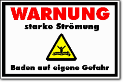weiß-schwarz-rot-gelb, WARN'UNG starke Strömung Baden auf eigene Gefahr, Symbol: Warnschild "Strömung"