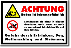 Kunststoff, weiß-schwarz-rot-gelb, ACHTUNG Baden ist lebensgefährlich Schwimmen Sie nicht in diesem Gewässer, auch wenn es noch so verlockend ist. Achten Sie auf Ihre Kinder Gefahr durch Ertrinken, Sog, Wellenschlag und Strömung, Symbol: Warnschild "Wellenschlag" / Verbot: Schwimmen