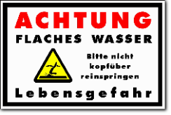 weiß-schwarz-rot-gelb, ACHTUNG Flaches Wasser Bitte nicht kopfüber reinspringen Lebensgefahr, Symbol: Warnzeichen "flaches Wasser"