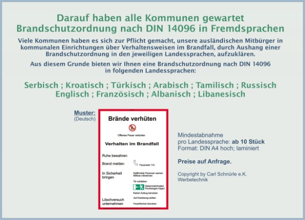 Die Beschriftung der Brandschutzordnung in Fremdsprachen richtet sich nur nach der auf unserer Internetseite abgebildeten Muster-Brandschutzordnung (in Deutsch). Textänderungen sind leider nicht möglich.