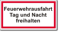 Verkehrzeichen nach StVO, Typ 1, Rand: rot, Text: schwarz; Feuerwehrausfahrt Tag und Nacht freihalten