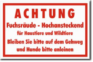 KSt., weiß-rot, ACHTUNG Fuchsräude - Hochansteckend für Haustiere und Wildtiere Bleiben Sie bitte auf dem Gehweg und Hunde bitte anleinen