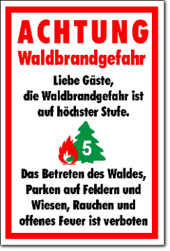 KSt., weiß-rot-schw.-grün, ACHTUNG Waldbrandgefahr Liebe Gäaste, die Waldbrandgefahr ist auf höchster Stufe "5" Das Betreten des Waldes, Parken auf Feldern und Wiesen, Rauchen und offenes Feuer ist verboten