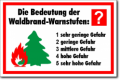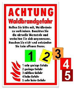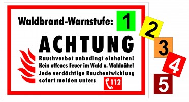 KSt., weiß-rot-schw., ACHTUNG Waldbrandgefahr Helfen Sie bitte mit, Waldbrände zu verhindern. Beachten Sie die aktuelle Warnstufe und verhalten Sie sich angemesen. Rauchen Sie nicht und entzünden Sie kein offenes Feuer. 1 sehr geringe Gefahr 2 geringe Gefahr 3 mittlere Gefahr 4 hohe Gefahr 5 sehr hohe Gefahr / (Freifeld für Ziffern zur Selbstbeschriftung) / (ohne Ziffern, bitte seperat bestellen)