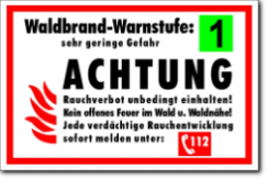 KSt., weiß-rot-schw.grün, Waldbrand-Warnstufe 1 sehr geringe Gefahr ACHTUNG Rauchverbot unbedingt einhalten! Kein offenes Feuer im Wald u. Waldnähe Jede verdächtige Rauchentwicklung sofort melden unter 112 + Symbole: Notruf + Feuerzeichen