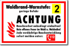 KSt., weiß-rot-schw.gelb, Waldbrand-Warnstufe 2 geringe Gefahr ACHTUNG Rauchverbot unbedingt einhalten! Kein offenes Feuer im Wald u. Waldnähe Jede verdächtige Rauchentwicklung sofort melden unter 112 + Symbole: Notruf + Feuerzeichen