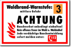 KSt., weiß-rot-schw.-orange, Waldbrand-Warnstufe 3 mittlere Gefahr ACHTUNG Rauchverbot unbedingt einhalten! Kein offenes Feuer im Wald u. Waldnähe Jede verdächtige Rauchentwicklung sofort melden unter 112 + Symbole: Notruf + Feuerzeichen