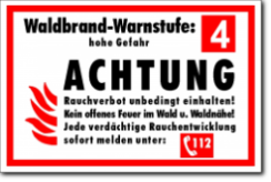 KSt., weiß-rot-schw.-rot, Waldbrand-Warnstufe 4 hohe Gefahr ACHTUNG Rauchverbot unbedingt einhalten! Kein offenes Feuer im Wald u. Waldnähe Jede verdächtige Rauchentwicklung sofort melden unter 112 + Symbole: Notruf + Feuerzeichen