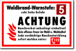 KSt., weiß-rot-schw.-dunkelrot, Waldbrand-Warnstufe 5 sehr hohe Gefahr ACHTUNG Rauchverbot unbedingt einhalten! Kein offenes Feuer im Wald u. Waldnähe Jede verdächtige Rauchentwicklung sofort melden unter 112 + Symbole: Notruf + Feuerzeichen