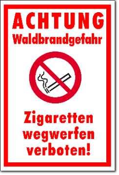 KSt., weiß-rot-schw., ACHTUNG Waldbrandgefahr Zigaretten wegwerfen verboten! Symbol: Rauchverbot