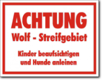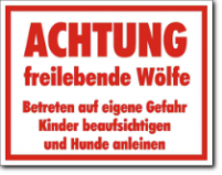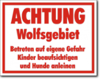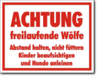 KSt., weiß-rot, ACHTUNG freilaufende Wölfe Abstand halten, nicht füttern Kinder beaufsichtigen und Hunde anleinen