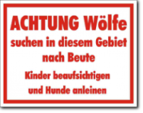 KSt., weiß-rot, ACHTUNG Wölfe suchen in diesem Gebiet nach Beute Kinder beaufsichtigen und Hunde anleinen