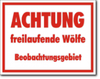 KSt., weiß-rot, ACHTUNG freilaufende Wölfe Beobachtungsgebiet