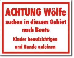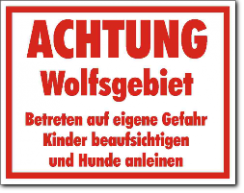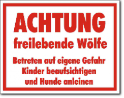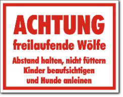 KSt., weiß-rot, ACHTUNG freilaufende Wölfe Abstand halten, nicht füttern Kinder beaufsichtigen und Hunde anleinen