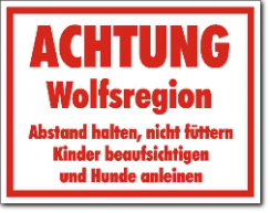 KSt., weiß-rot, ACHTUNG Wolfsregion Abstand halten, nicht füttern Kinder beaufsichtigen und Hunde anleinen