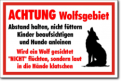 KSt., weiß-rot-schwarz, ACHTUNG Wolfsgebiet Abstand halten, nicht füttern Kinder beaufsichtigen und Hunde anleinen Wird ein Wolf gesichtet "NICHT" flüchten, sondern laut in die Hände klatschen